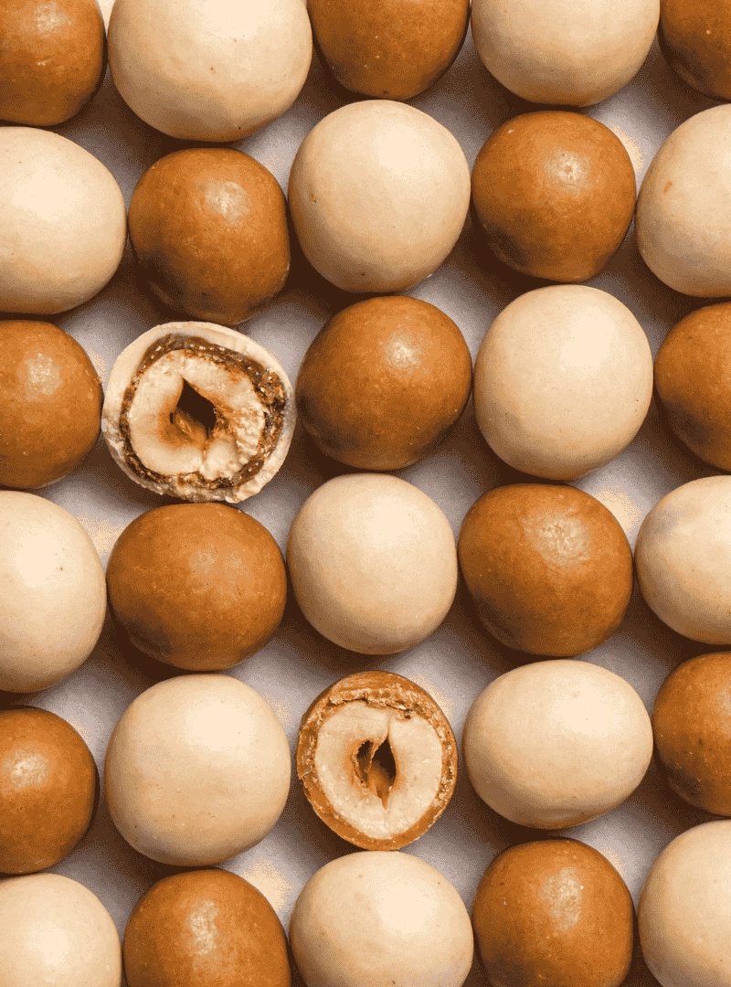 hazelnuts, coconut sugar, demerara sugar, cocoa butter, dry coconut milk, filtered water, cashew nuts, roasted sesame, buckwheat tea, coconut oil, locust bean gum, sunflower lecithin, Himalayan salt, natural Bourbon vanilla bean.