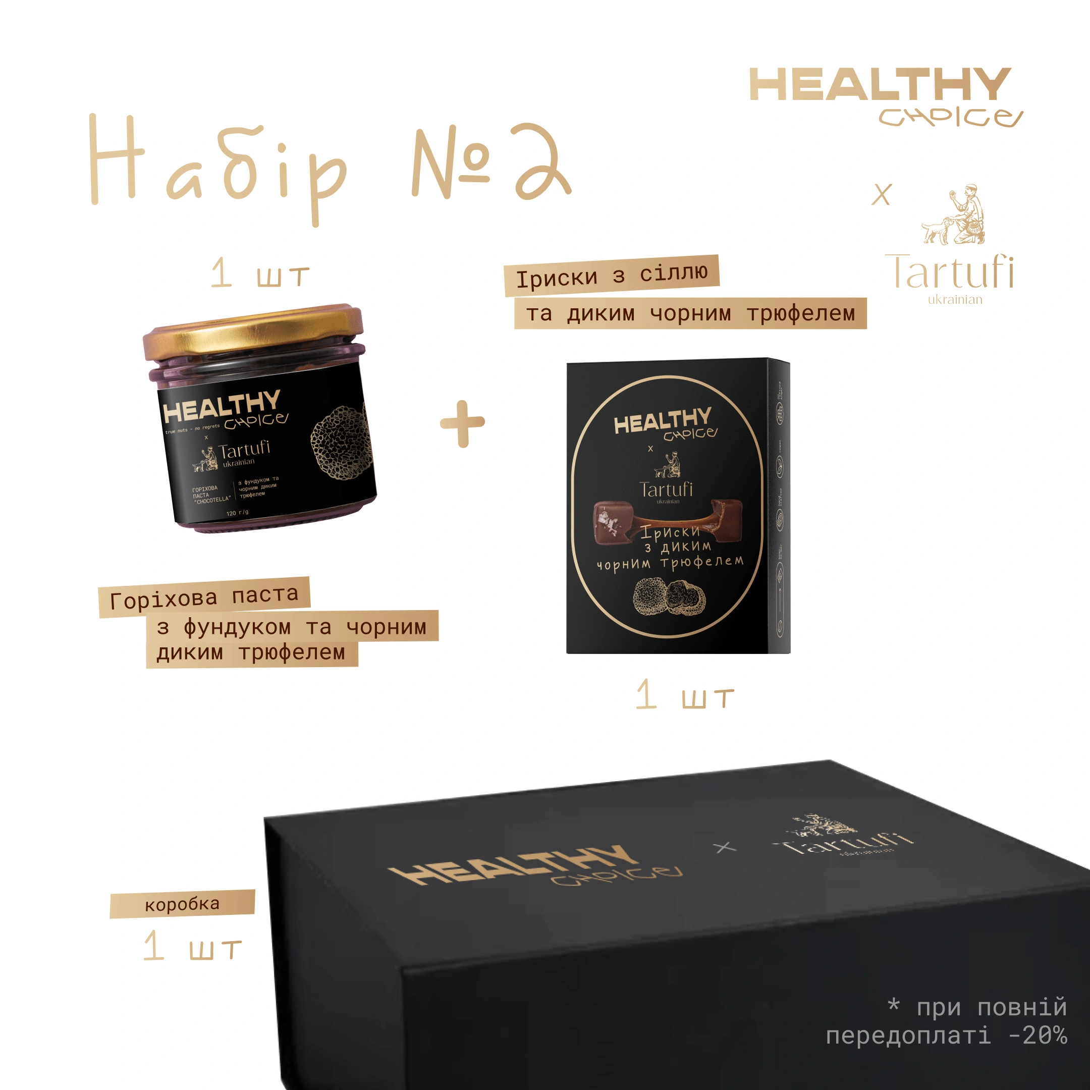 Іриски з сіллю fleur de sel з чорним диким трюфелем Склад: кокосове молоко, карпаччо з дикого чорного трюфелю (tuber aestivum), кокосовий сироп, какао-боби, цукор кокосовий, цукор мусковадо, горіх кеш’ю, сіль fleur de sel, сіль гімалайська.