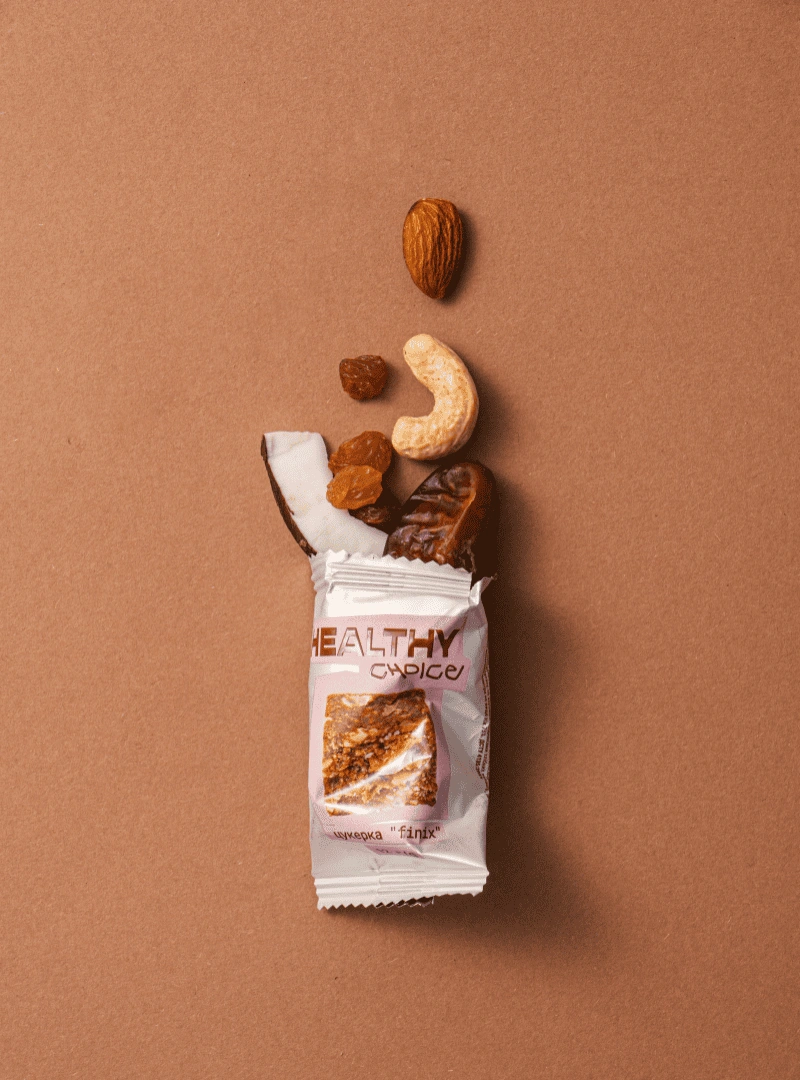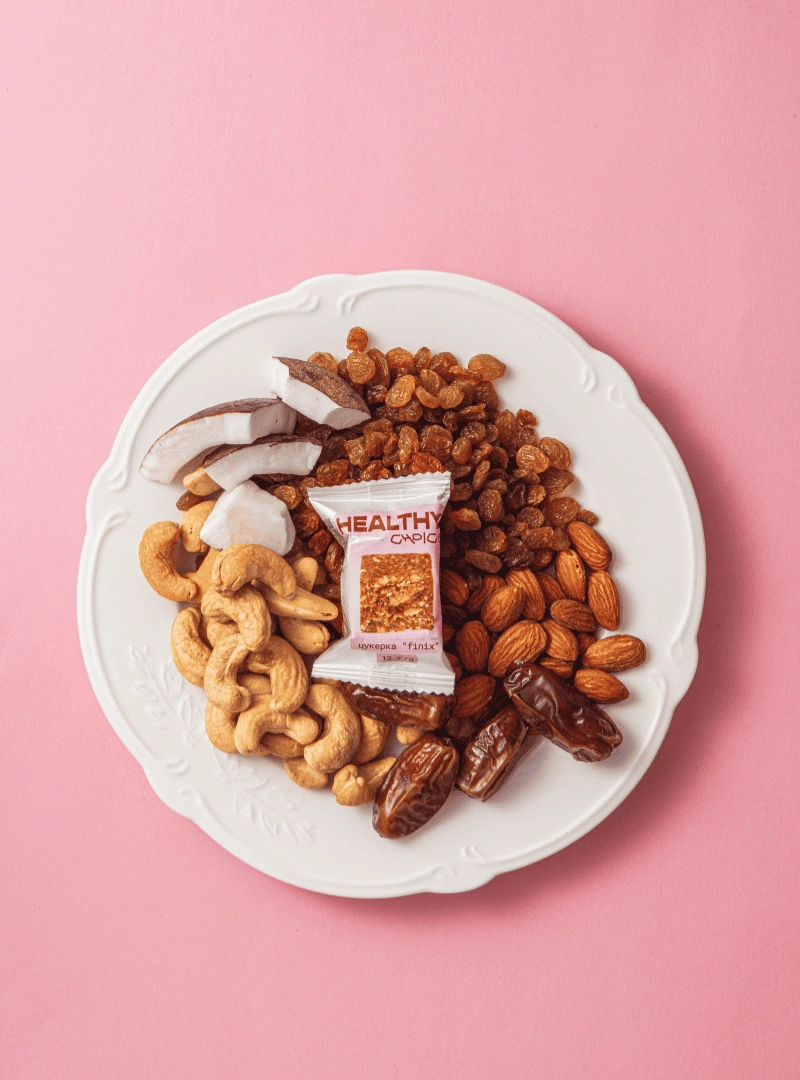 фінік сушений, ізюм сушений, горіх мигдаль, горіх кеш’ю, кокосова стружка.