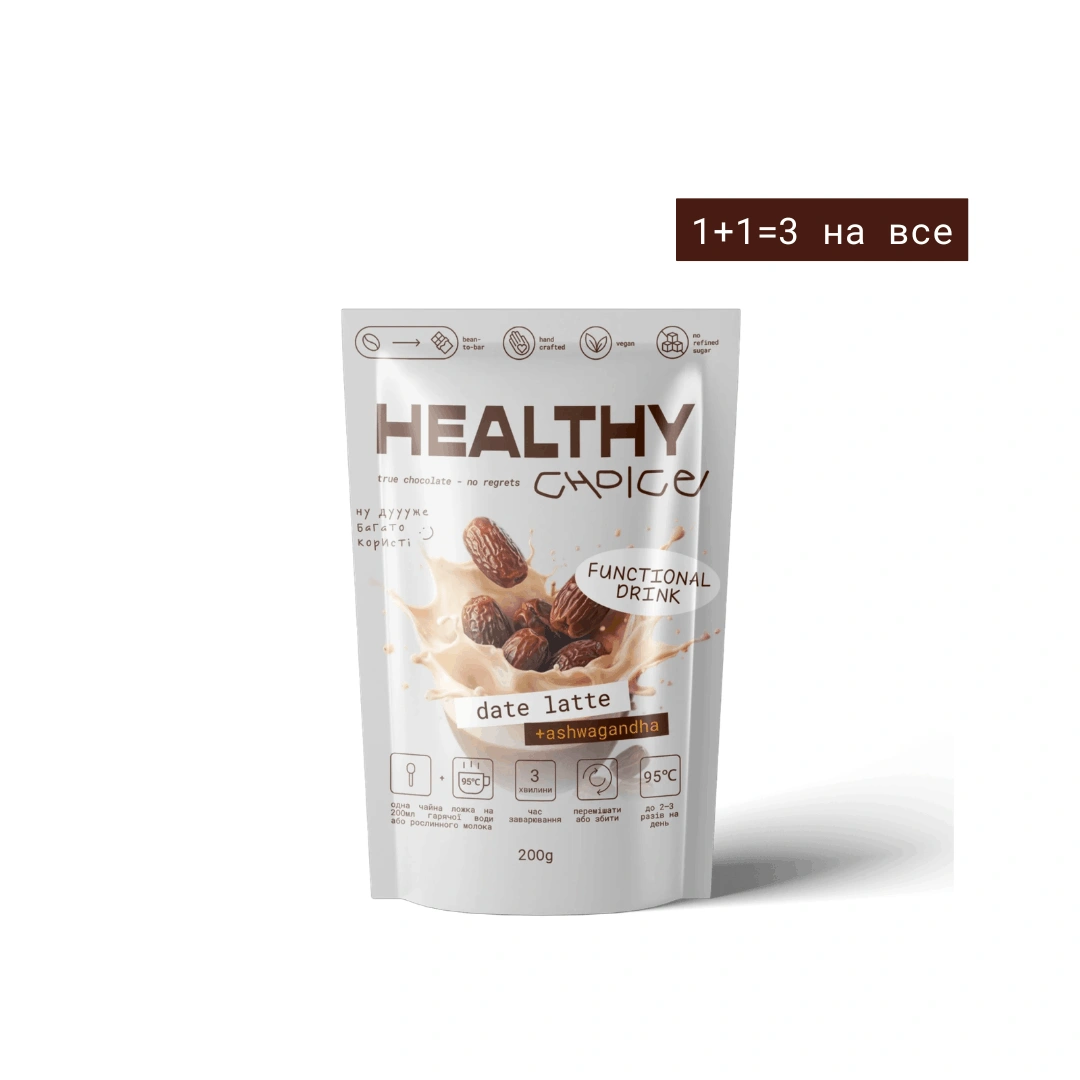 Кісточки фініків ферментовані, молоко кокосове сухе, порошок фініків органічний, тростинний цукор, вершки кокосові сухі, інулін, ашваганда (порошок кореня), сіль, кориця, ванільна паличка “Бурбон”.
