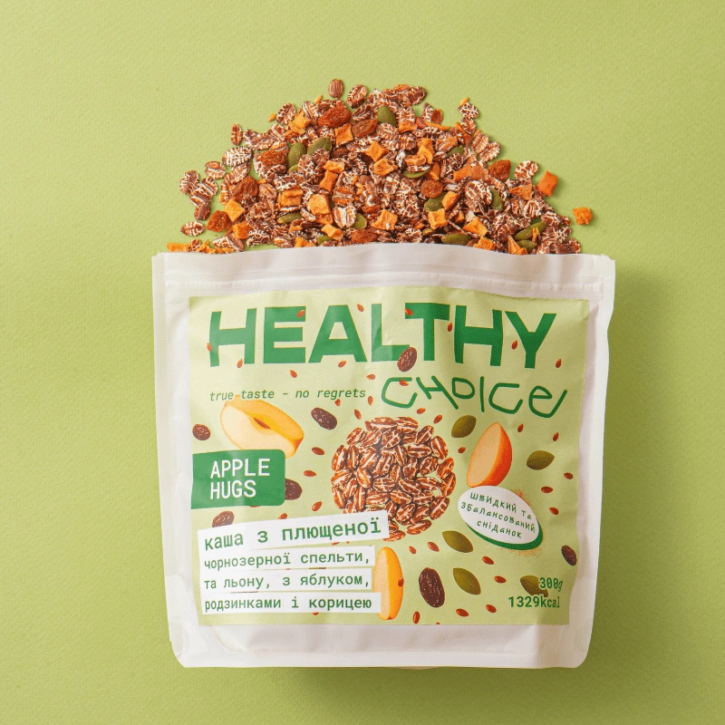 Склад: Льон золотий, спельта чорнозерна, ячмінь, яблука сушені, гарбузове насіння, кориця, ізюм, цукор демерара.