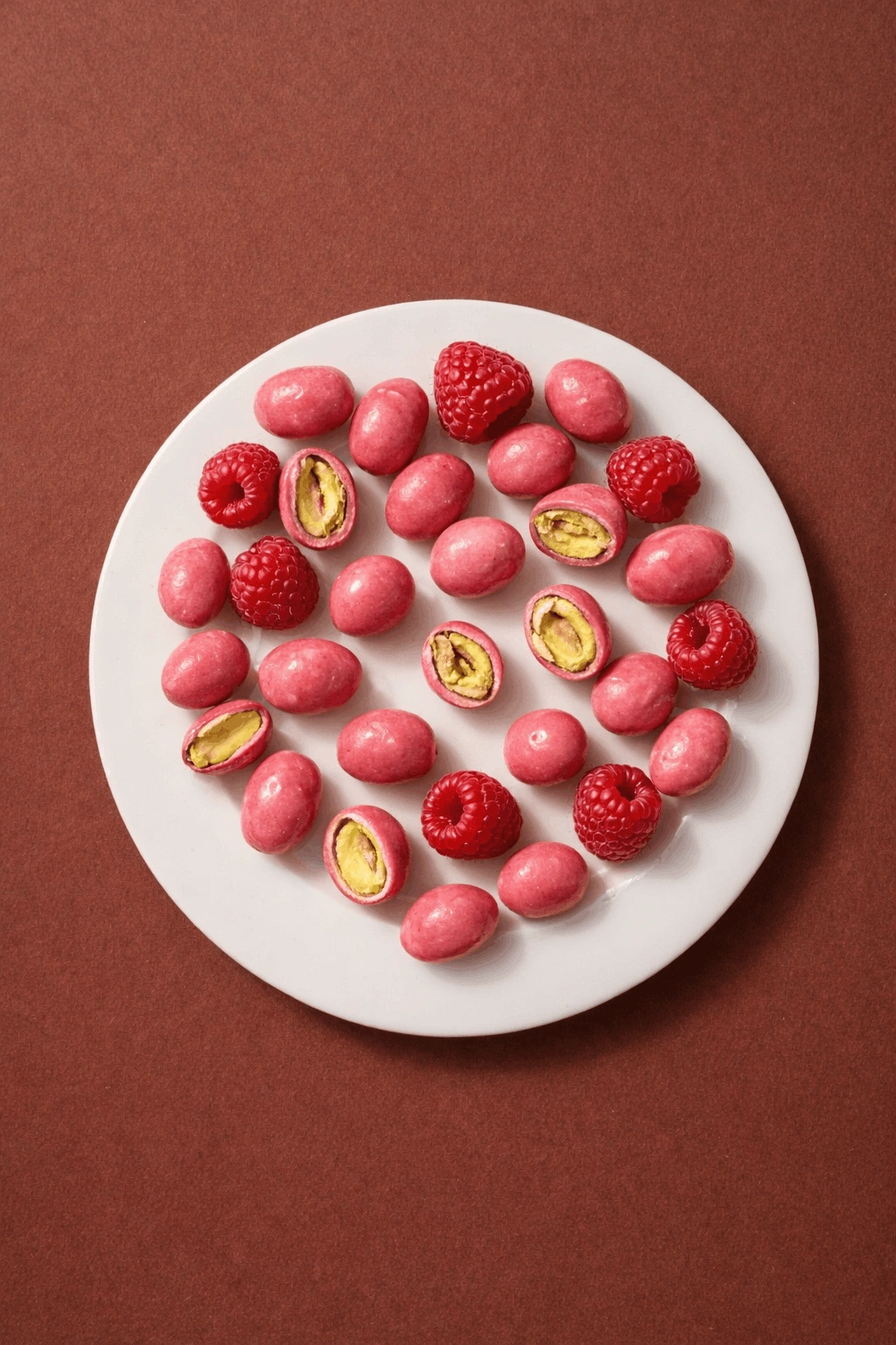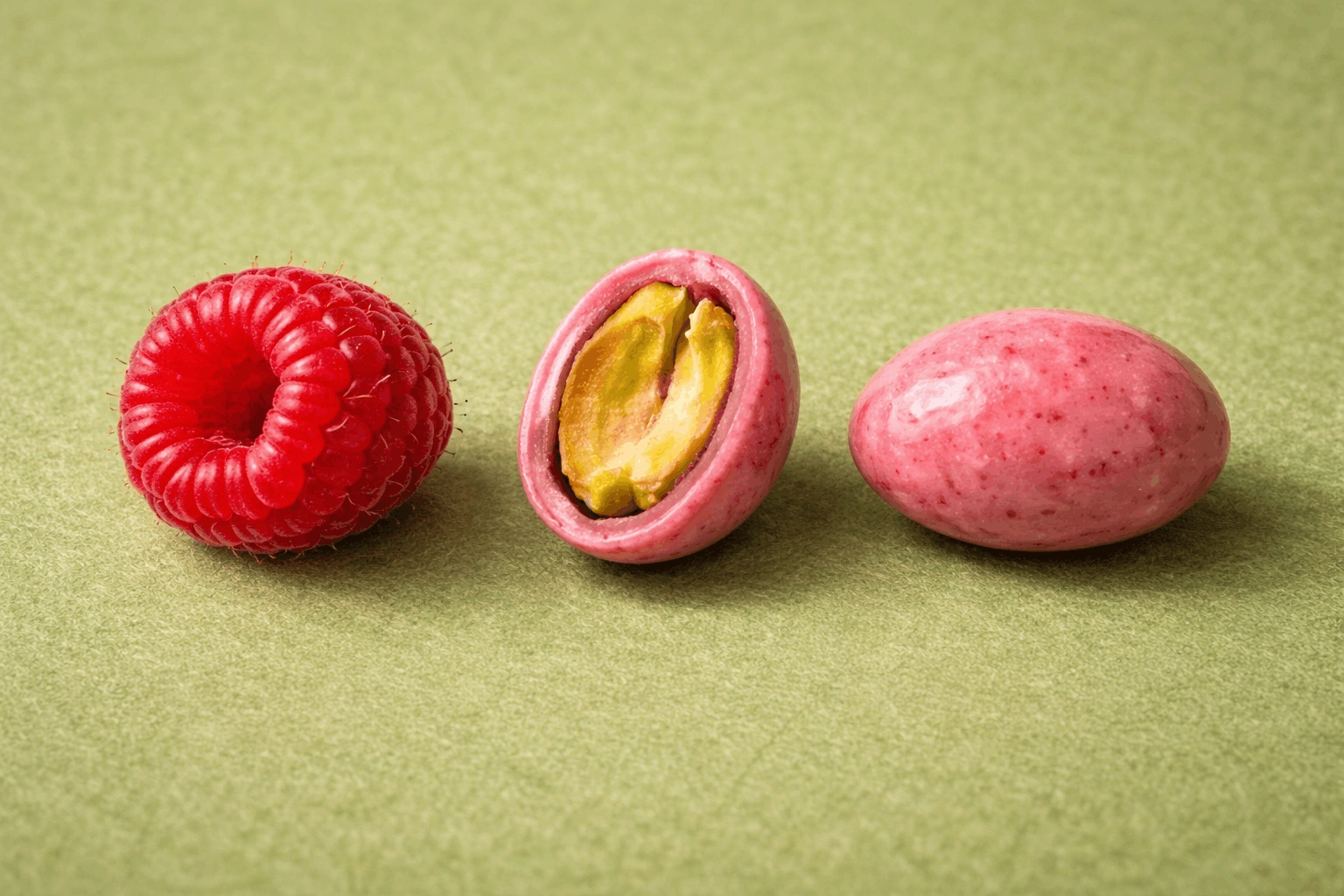 Склад: фісташка, какао-масло, мальтитол, молоко кокосове сухе, тростинний цукор, інулін, порошок малиновий, олія кокосова.