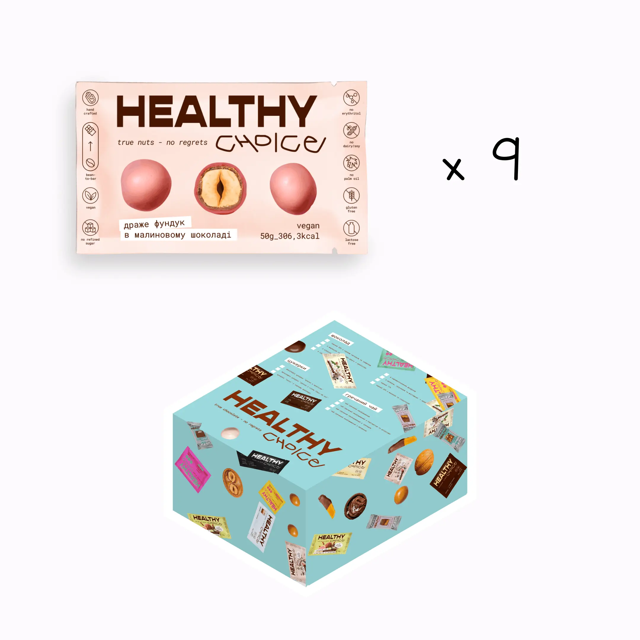 горіх фундук, масло какао, натуральний цукрозамінник – мальтитол (E965), горіх кеш’ю, цукор демерара, інулін (пребіотик), сублімована малина, вода фільтрована, кокосова олія, камедь ріжкового дерева, сіль гімалайська, ванільна паличка “Бурбон” натуральна.